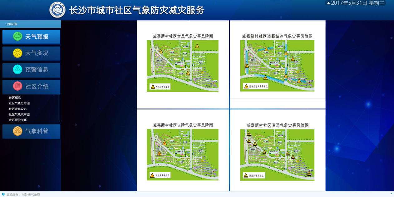 通过调用指定文件夹下的内容,社区居民可通过触摸屏了解相关气象知识,另外还可通过该模块了解社区内气象灾害分布图、社区避难设施、领导视察、社区风采等服务信息,便于社区居民更加直观便捷的了解社区气象服务内容。