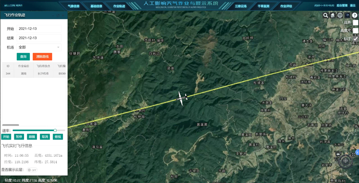 为提高人工影响天气信息综合管理能力和作业指挥能力,设计开发了基于气象大数据云平台的人工影响天气精准作业指挥与展示系统。系统基于国内自主研发的GIS平台DMGIS,集成湖南省高分遥感地理信息数据、人影信息数据以及气象监测数据,实现湖南人影作业全域精细化三维地理场景的漫游展示,人影作业飞行轨迹回放,作业效果评估,以及人影、气象信息空间可视化分析展示等功能,同时系统可实现三维GIS的基本功能。系统的建设为湖南人影业务完全三维空间GIS可视化和安全作业提供了技术支持。